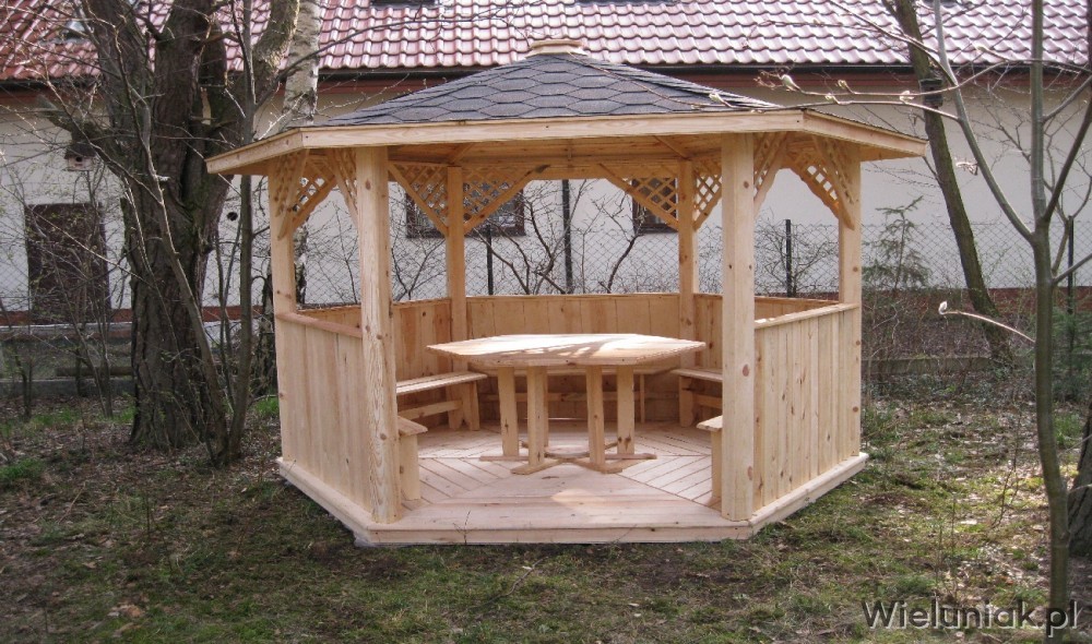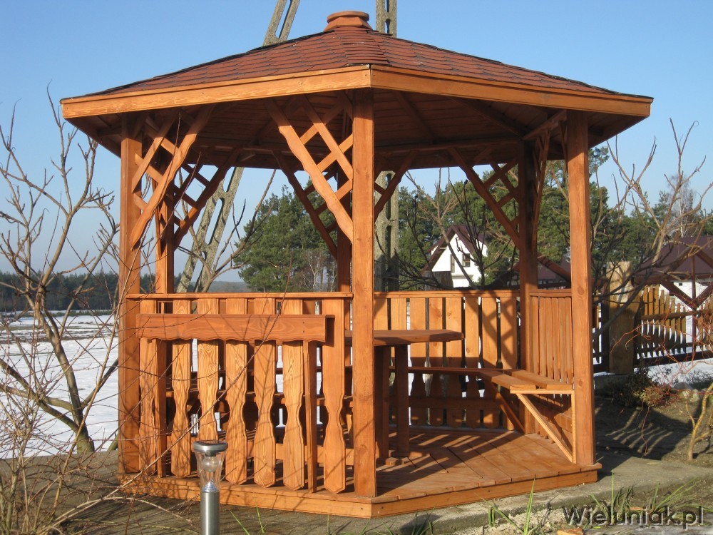 Altany ogrodowe wykonywane są z drewna sosnowego. Każda altana drewniana jest ustawiana na odpowiednio rozmieszczonych i wypoziomowanych podkładach betonowych, które zabezpieczają przed gromadzeniem się wody pod podłogą altany i zapewniają cyrkulację powietrza pod podłogą. Stosujemy również agrowłókninę, której zadaniem jest zapobieganie przerastaniu roślinności między deskami podłogowymi. Słupy altany mają wysokość 200 cm, natomiast całkowita wysokość altany wynosi 270 cm. Dachy altan wykonane są z desek boazeryjnych oraz pokryte gontem bitumicznym co zapewnia długoletnią trwałość każdej altany oraz odpowiednie wrażenia estetyczne. Każda z altan wyposażona jest w zestaw mebli, na który składają się stół z sześciokątnym blatem oraz 5 ławek, zamocowanych do altany. Wszystkie elementy altany są odpowiednio strugane oraz dwukrotnie impregnowane. Na życzenie klienta możemy zamontować w altanie oświetlenie oraz dodatkowe kratownice. Wszystkie altany montujemy samodzielnie. Dostarczamy nasze produkty na terenie Polski oraz zagranicę. Koszty transportu uzgadniamy indywidualnie z każdym klientem.