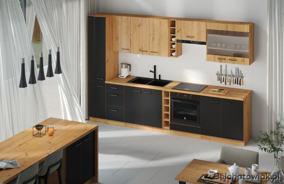 Zestaw Kuchenny MODENA 255cm*175cm. z blatem to przykład kuchni wielofunkcyjnej, w której znalazło się miejsce na zmywarkę, oraz piekarnik z płytą indukcyjną.