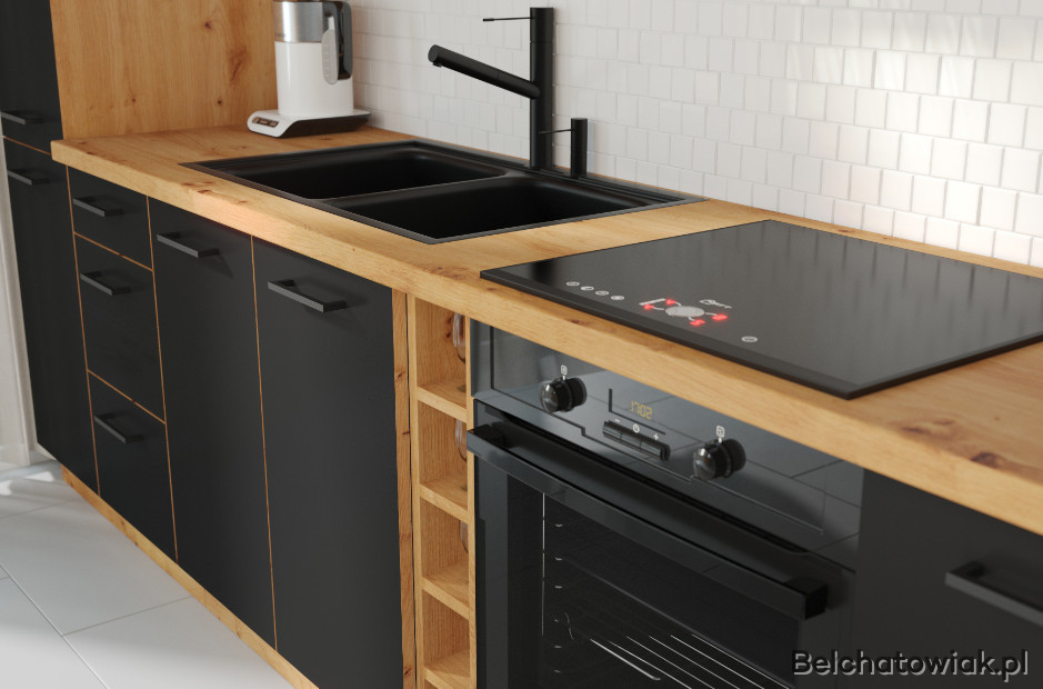Korpus kuchni wykonany jest również z płyty meblowej laminowanej, co umożliwia czyszczenie tej kuchni na mokro i wydłuża żywotność kuchni MODENA do 20 lat.
