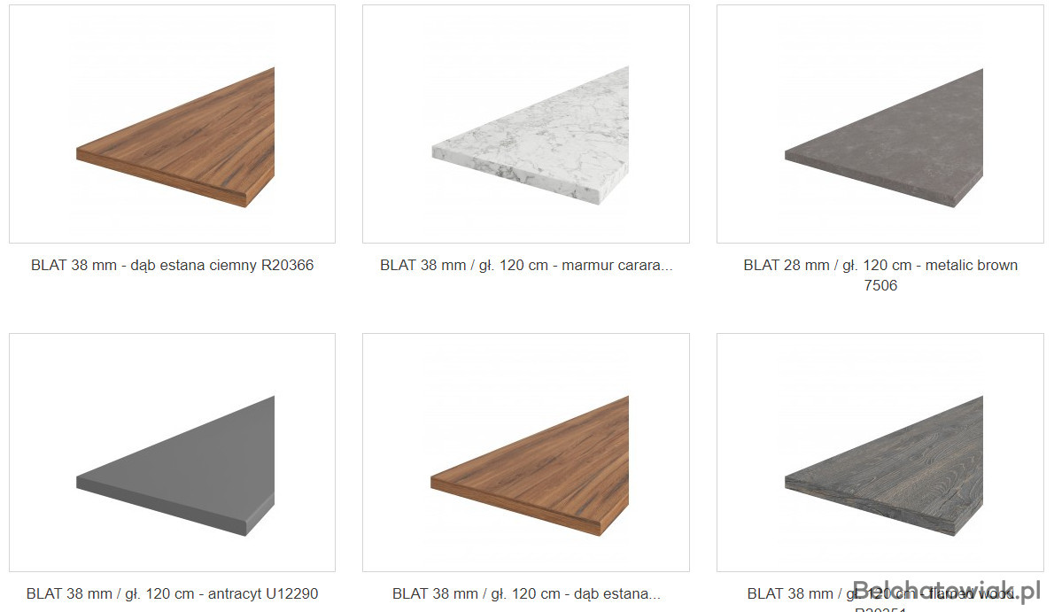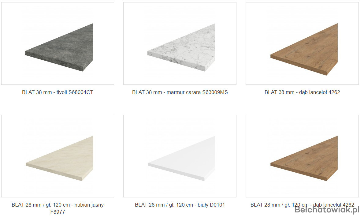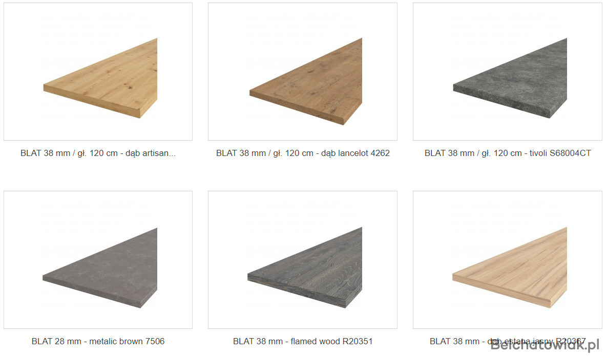 W skład zestawu kuchennego wchodzą blaty o długościach 195cm, 115 cm. Grubość tych blatów wynosi 38 mm.